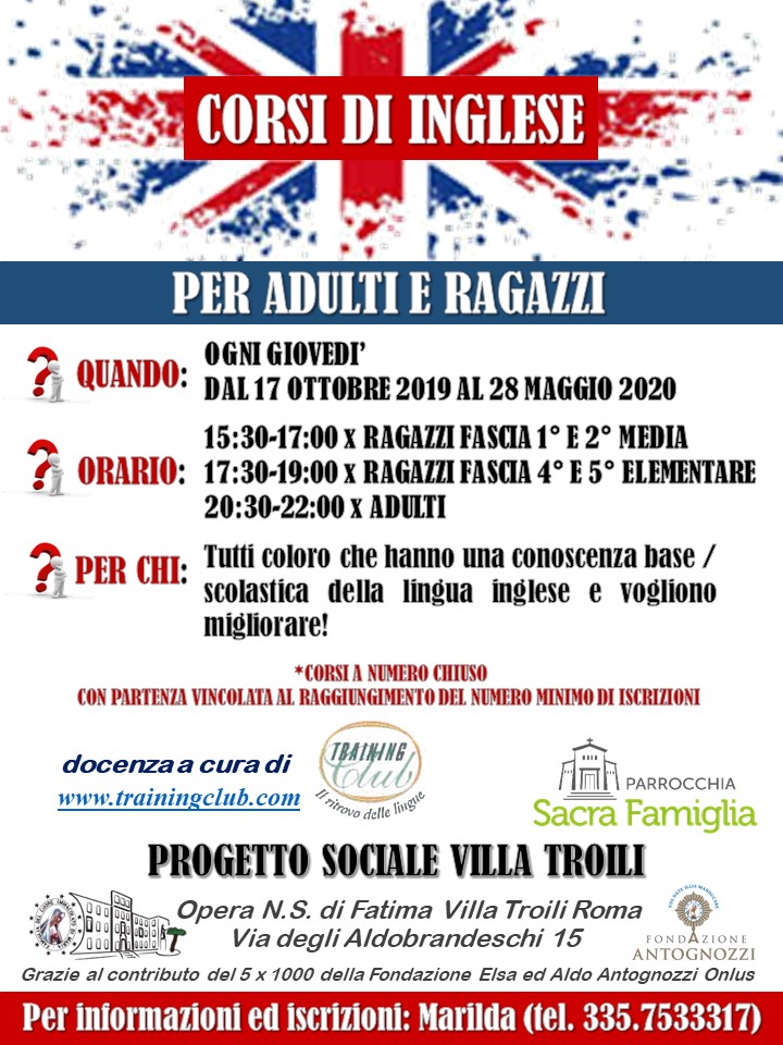 Il corso di lingua inglese si tiene nella Sala Pastorelli dell'Opera da Ottobre a Maggio ed è diviso fra quello dedicato ai bambini di 4° e 5° elementare, quello per i ragazzi delle scuole medie inferiori di 1° e 2° media. Il corso si tiene il Giovedì per i ragazzi delle scuole medie inferiori dalle ore 15:30 alle ore 17:00, mentre quello per i bambini di 4° e 5° elementare è dalle ore 17:30 alle ore 19:00.